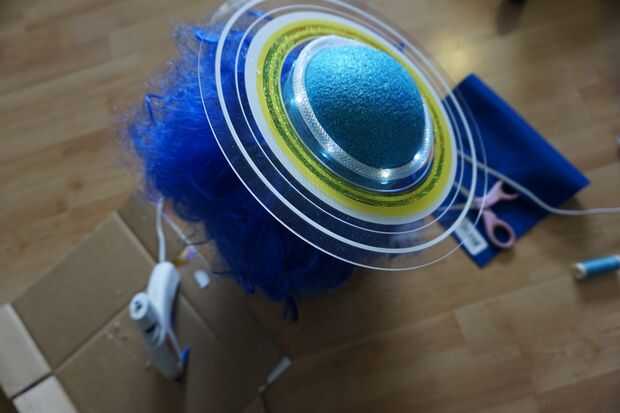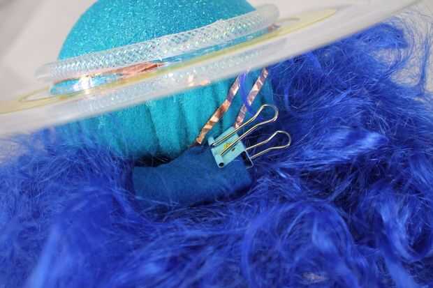 Usar más pegamento caliente para pegar con cuidado el planeta a la peluca. Con hilo y aguja, coser el fieltro a la malla de la peluca para que esté en forma segura. (Si usted no quiere usar una peluca, usted podría unir el fascinator a una diadema, pinza de pelo o sombrero)
