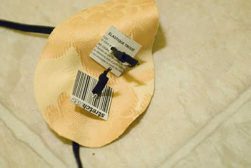 Corta dos pequeños pedazos de cartón y los extremos de su elástica a través de la alimentación y nudo para que no resbale hacia fuera. He añadido en estas piezas de cartón porque el punto de la elástica y el sombrero va a sufrir un estrés mucho ya que se estira alrededor de la cabeza. Por lo que se necesita mayor superficie para que el pegamento obtener un agarre firme, de lo contrario usted sólo ser pegado los nudos extremos del elástico al sombrero.