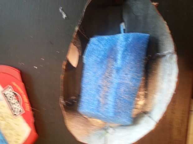 Cortar la tapa de plástico para caber en el interior y pegamento caliente en la parte superior de la espuma o papel y luego a dentro de los bordes.