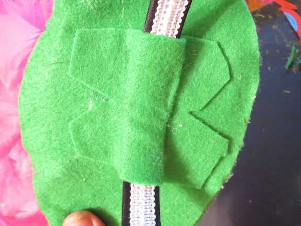 Corte un pedazo verde de fieltro y pegamento caliente sobre la diadema donde tendrá la base para la banda de la cabeza. Usar mucho pegamento caliente si es necesario y sujete firmemente. Mantenga el ángulo deseado en la mente durante este proceso.