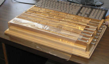 Los corchos se aplicó con pegamento en los extremos y poner en la plantilla, uno por uno. Luego los pernos al final se aprieten suavemente para sostenerlos en su lugar como el adhesivo se seque. Más adelante las unidades se retiran para su uso en los tableros de corcho. Este sistema permite tratar las juntas de corcho como una línea de producción si desea hacerlo de esa manera.