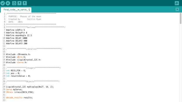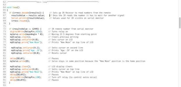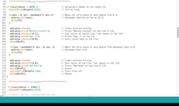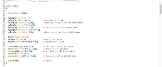 Primero definí todas las cosas que se vuelvan a producir en el código, haciéndolo más fácil de editar; LED, relé, moonAngle y retrasos. Luego incluí las bibliotecas; Algunos son estándares en el programa de Arduino. Después los enteros y los objetos que empecé en la puesta en marcha la función, entonces el bucle principal.