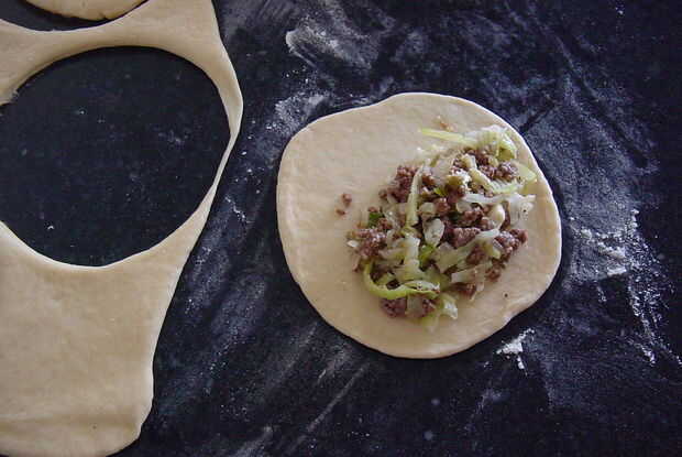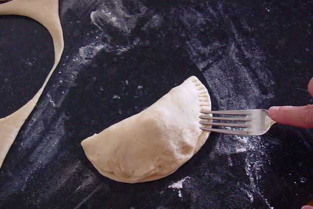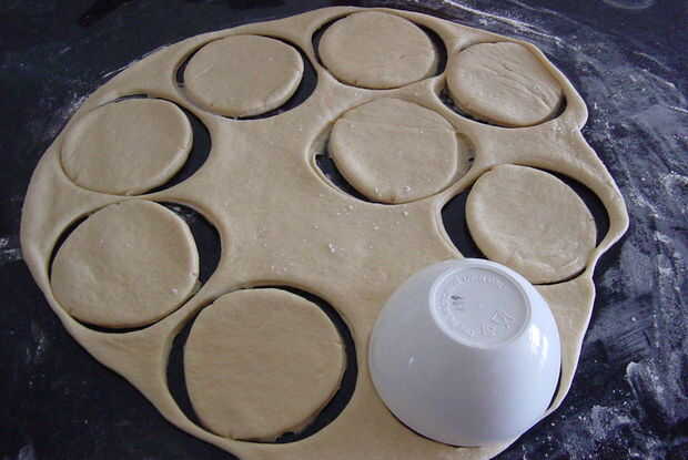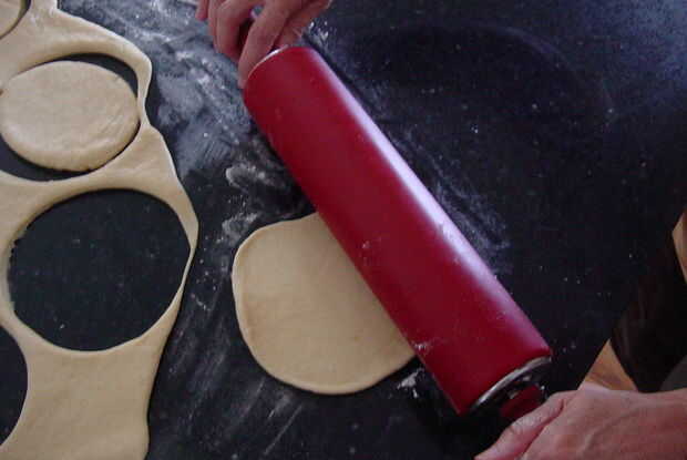 Aplaste la masa y estirar sobre una tabla enharinada. Cortar círculos de 5 a 6 pulgadas o cuadrados.