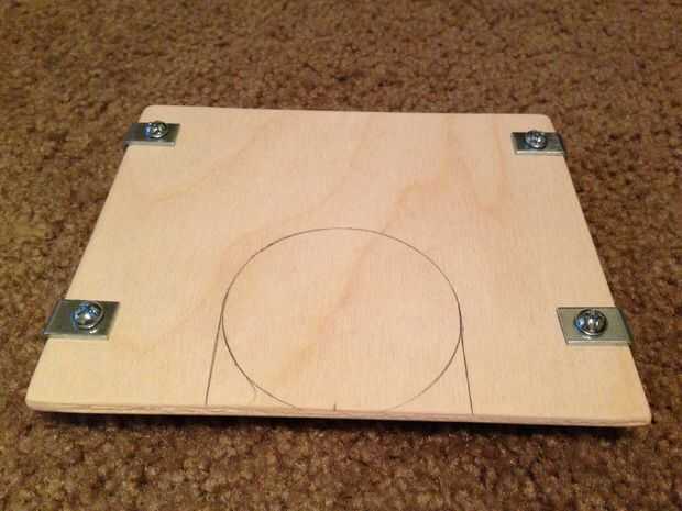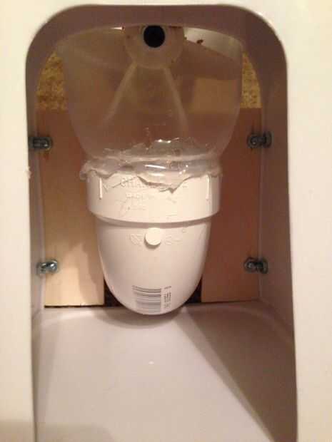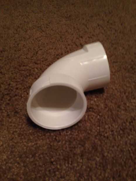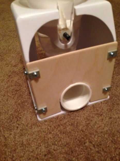 Esta era la parte más fácil. Usé la boca del tubo para trazar un contorno en el panel frontal. Luego até el tubo anguloso en la parte inferior de la cubeta utilizando pegamento caliente.