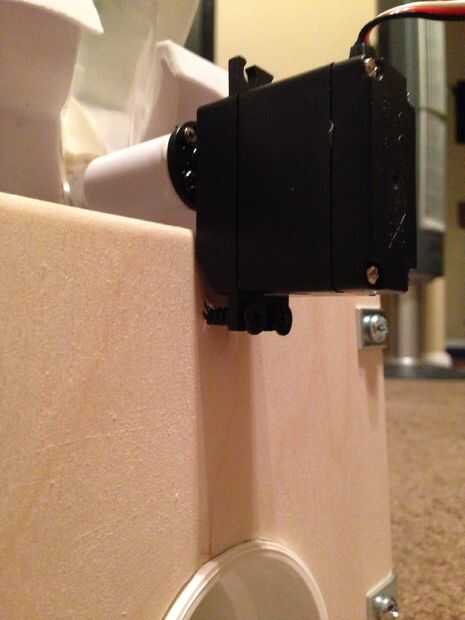 Ahora que todo eso se hace, podemos conectar el servo para que no se mueva mientras se da vuelta. Aquí utilicé dos tornillos para madera por la parte inferior de los agujeros del servo de montaje y atornillado a la madera.