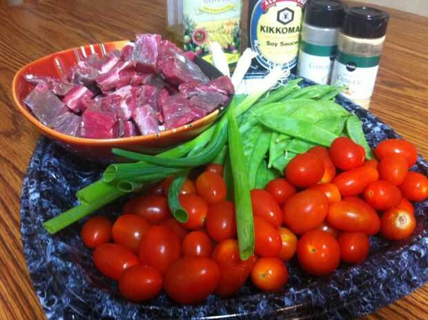 Reunir ingredientes - 1 cucharada Salsa de soja baja en sodio, 1/2 cucharadita de jengibre, molido 1 libra arrachera cortada en tiras largas, 1 cucharada de aceite de oliva (yo uso aceite de oliva para casi todo, porque es una opción más saludable que la mantequilla), 3 cebolletas, ajo en polvo 2 cucharadas, 6 onzas de arvejas y tomates 2 pintas.