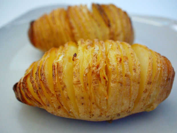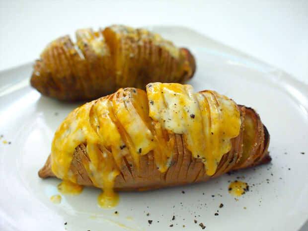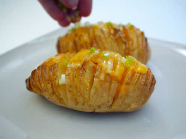 Usando uma faca de cozinha afiada, cuidadosamente começar a fazer uma série de cortes verticais transversalmente através de da batata, tomando cuidado para não cortar todo o caminho - cortes só deve ser de 3/4 caminho através de da batata.