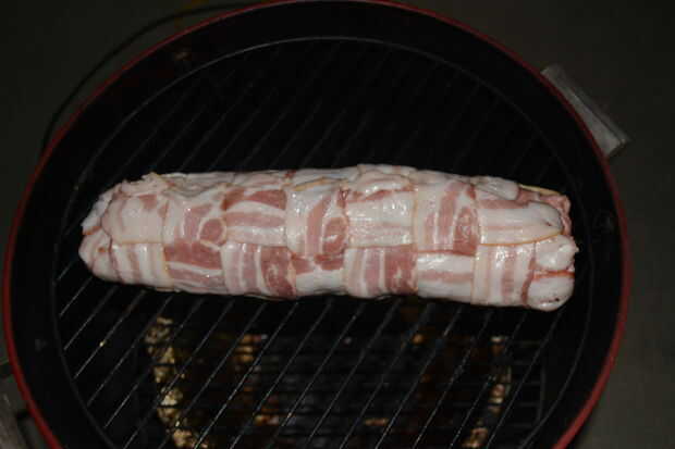 - Sacar la carne de cerdo-cicle el congelador y lo desenvolver con cuidado. Alinee con el borde de la tela de bacon. Lentamente enrolle el tocino alrededor de fattie usando el plástico bajo el tocino para mantenerlo apretado.
