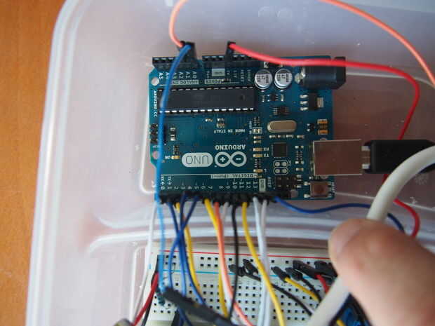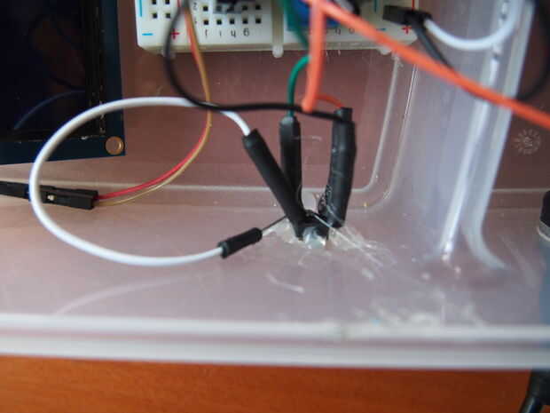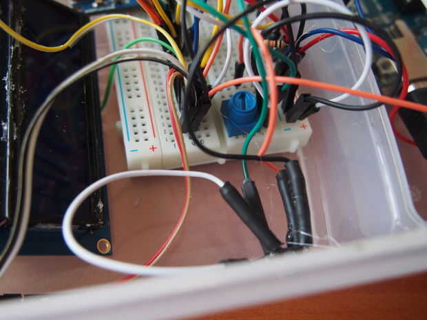 Hice un montón de configuración dentro de unas cajas de plástico para hacerlo accesible para llegar a la tarjeta SD, pero también sobre todo estancos. No bastante, pero funciona. Montón de cables por todos los componentes. Tenía que personalizar unos cables para mis necesidades (por ejemplo alambre de resistencia, los cables del botón, etc.)