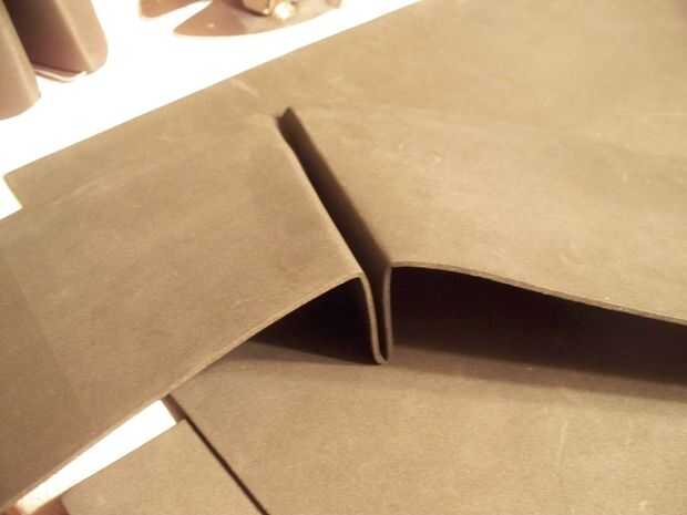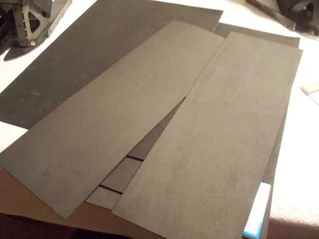 Los cascos fueron hechos de una media hoja de la espuma de célula cerrada arte. Cada hoja era primero doblado en mitad del camino largo y luego cortar una tira. Luego dobla la tira en la mitad del camino corto y engrapado a lo largo del pliegue. La espuma entonces fue doblada sobre sí mismo en forma diagonal simétrico para hacer el enganche hendido. Después de envolver la espuma alrededor de la extensión de la pierna, era también clavado en el lugar y luego recortar con tijeras. Me ha preocupado los remaches atravesaría la espuma pero funcionó muy bien. Uno de los cascos incluso consiguió pisar lo suficiente para romper la espuma en la parte delantera pero no rip en el remache.