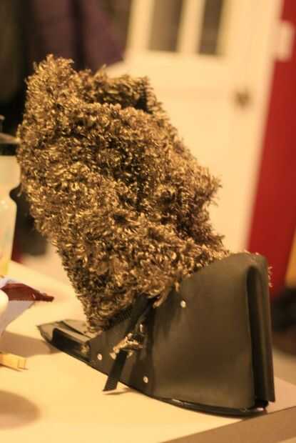 Finalmente, los cascos fueron envueltos en pedazos de remanente de la piel del faux. Debido a una contracción del tiempo, recurrí a grapar la piel sobre el material de lona plástica y funcionó muy bien. Una 3" tira de velcro fue con grapas en cada pie para mantener la piel en el lugar cuando envuelto sobre nuestros pies. Coloca el velcro un poco demasiado baja para que la piel era drapeado abajo. Más tendrá que ser añadido antes de usarlos otra vez.