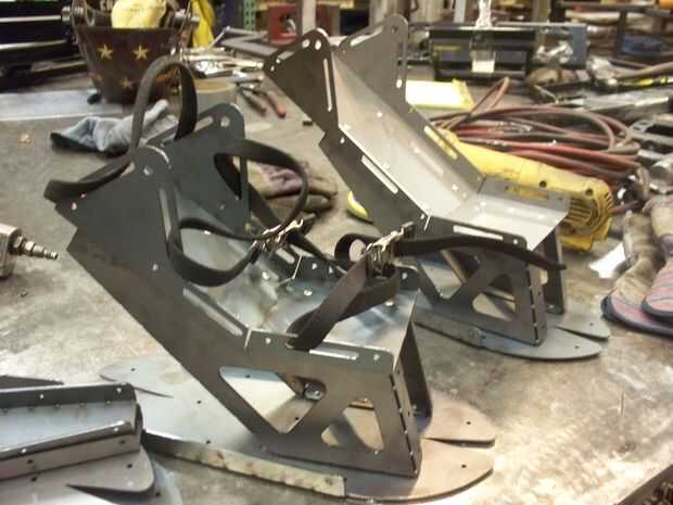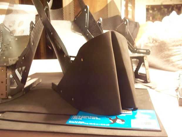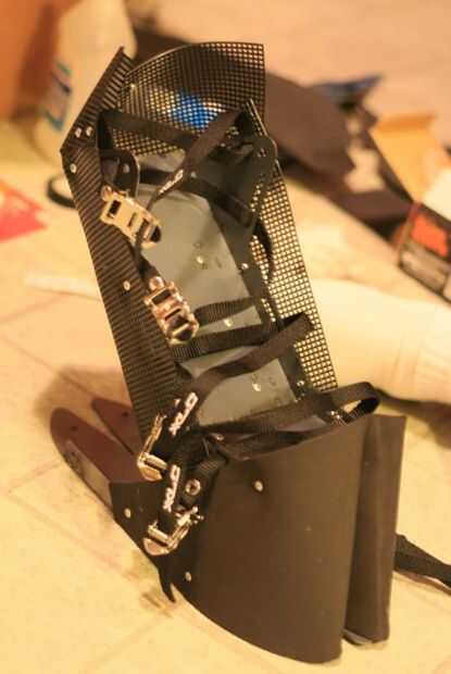 El material de lona plástica fue remachado a agujeros adicionales hechas en las extensiones y luego de cortado y alrededor de los tobillos. Una hoja se utiliza para cada pie.