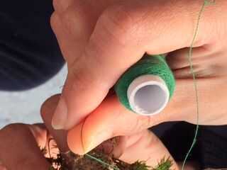 Coloque pedazos de musgo en las ramas del árbol con el hilo de algodón verde.