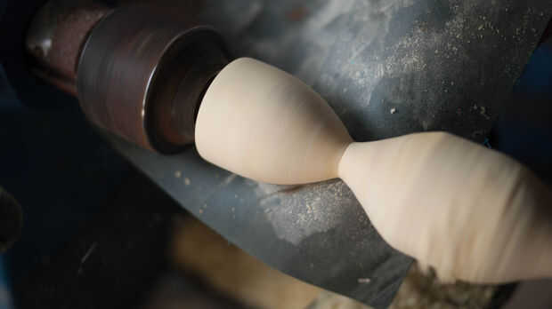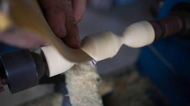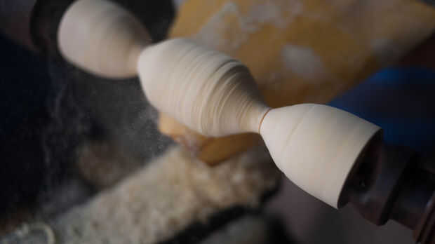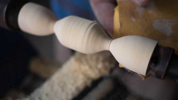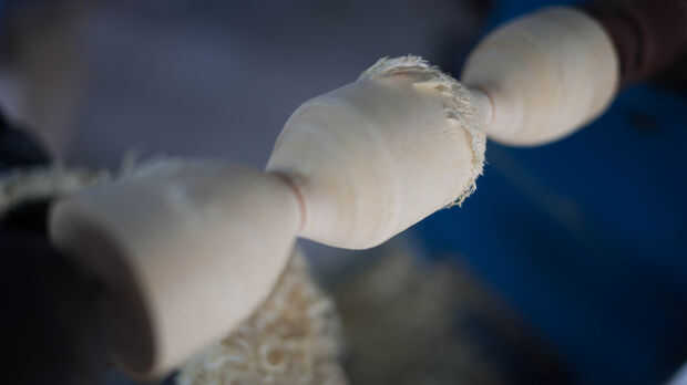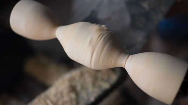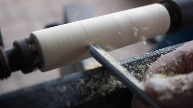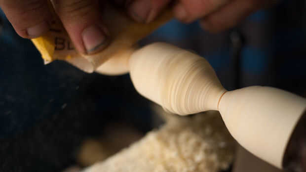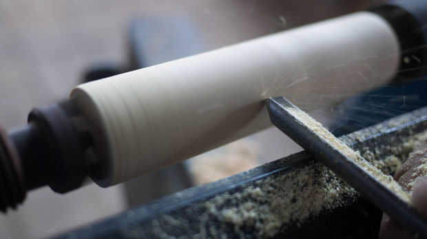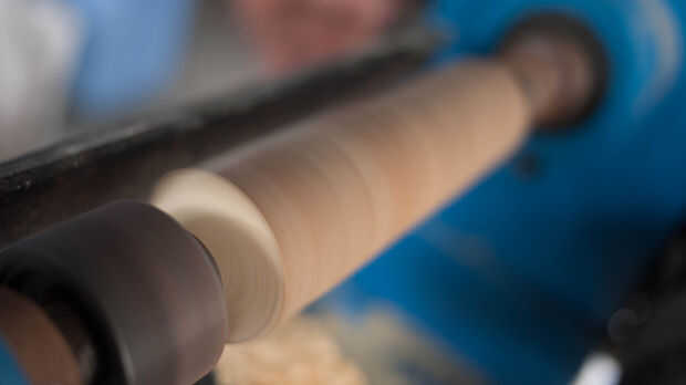 Una vez redondeada paró el torno y marcado unos 32mm de cada extremo de la madera. Estos iban a ser mi marca. Empecé a tomar estas abajo usando una gubia y el cincel de un raspador cuando llegué cerca de la base. Usé un cincel para sesgar para mantener mi linea en la madera como he trabajado en el trabajo.