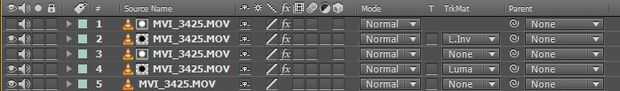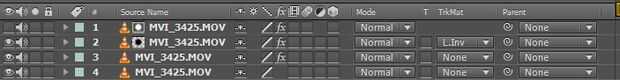 En la línea de tiempo, en la sección "TrkMat", utilice el menú desplegable y seleccione "Luma mate". (¿Recuerdan cómo lo hicimos "luma invertida mate" antes? Sólo hacer "Luma mate" ahora).