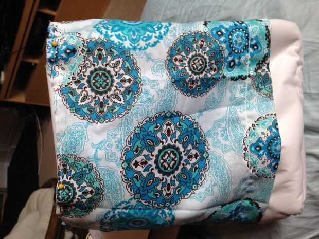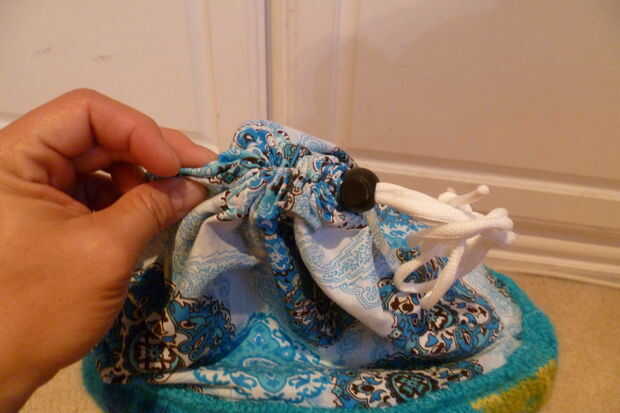 Deslice a la tela decorativa circular sobre el forro PUL con la carcasa de cordón apuntando hacia la parte inferior de la bolsa y emparejar a la costura superior de la funda. Coser la parte inferior de la bolsa decorativa en la parte superior del forro.