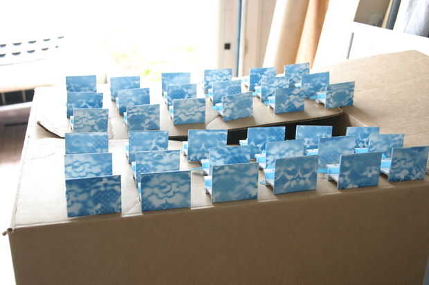 Coloque el carril lado piezas de canal hacia abajo, como los que en la parte posterior de la primera foto. Coloque el conjunto forma una superficie sólida, como un rompecabezas. Una vez hecho esto, coloque su encaje sobre las espaldas de los pedazos de la pista. el cordón debe cubren las espaldas de las pistas. Les rocie en su color de elección, dejó seco.
