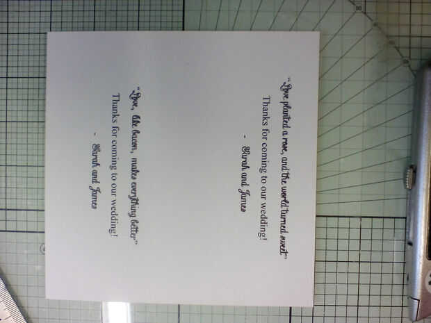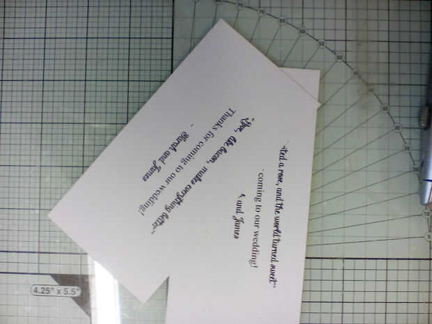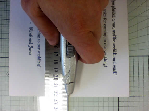 Después de haber impreso tus favores, cortado a la medida para que cada hoja mide 3 x 6 pulgadas. Usted puede hacer esto con un cuchillo y una regla, tijeras o guillotina - lo encuentre más cómodo de usar!