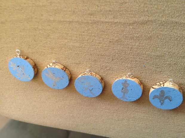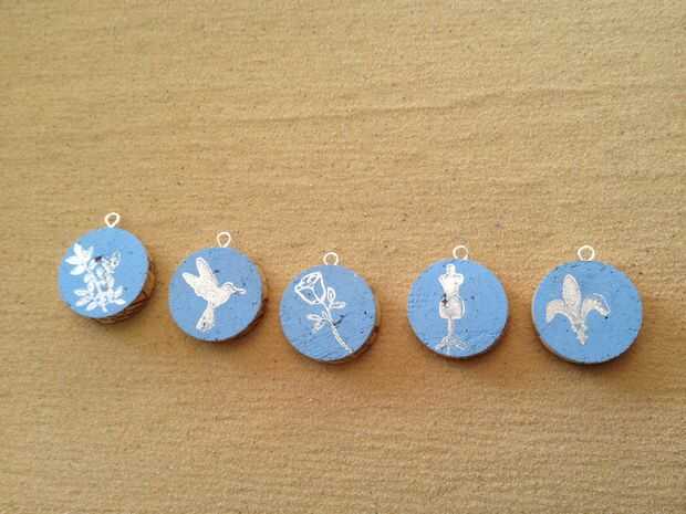 Una vez que tenemos todas las piezas aros, pinté un una lado capa de corcho. Elegí azul, porque es uno de los colores de la boda. Use pequeñas cantidades de pintura del cepillo para que no hay en los lados de las rebanadas de corcho. Experimenté sin poner una capa base de pintura, sin duda tenía promesa. Después de que la pintura seque, había estampado diferentes imágenes en la parte superior de las cosas que nosotros, o los diseños al azar. He usado una tinta plata.
