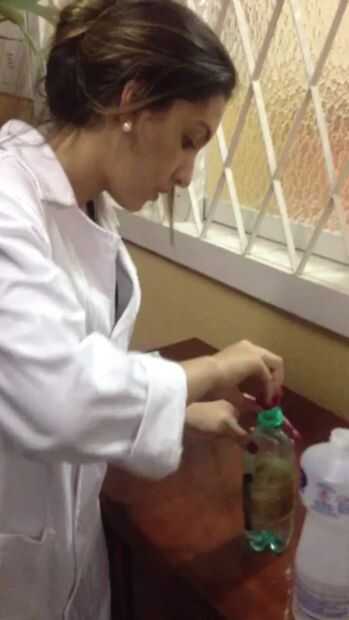 Agora realización una quantidade de três tampas de álcool dentro da garrafa pet, abrir e chacoalhe para espalhar.