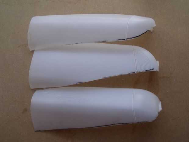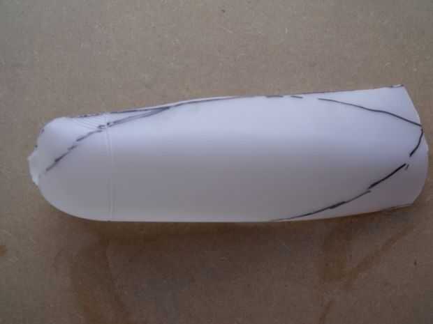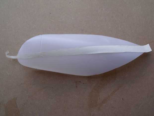 Cortar la botella con un par de tijeras en tres partes más o menos iguales. Dibujar una forma puntiaguda en ambos extremos de cada parte. Pegar una pequeña tira de cinta por el centro para guiar el corte adicional.