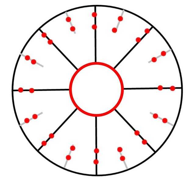 Cortar un círculo de la tapa o el fondo de un pote de yogur o hielo. Hacer una abertura en el centro de montaje alrededor de la toma. Dividir el iring restante en 8 partes iguales con un lápiz. Hacer pequeños agujeros en las líneas y en medio de las partes. Ver todos los puntos rojos en el dibujo.