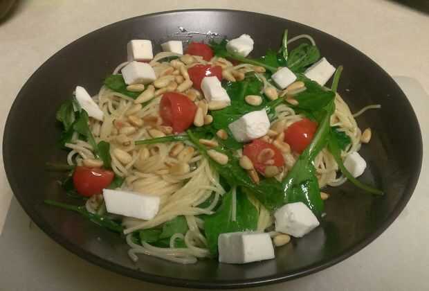 Rápido y fácil fecha cena incluye postre de frutas y curso principal de arranque.Motor de arranque es tazas de ensalada de lechuga con pepino, rábano, zanahoria, tomatitos.Plato principal hamburguesa de pan de ajo con tortilla de fideos con fideos ro