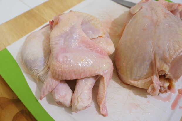 Paso 1: Elegir un pollo entero Preparar el pollo... Pongo un diente si ajo, media cebolla y apio dentro el pollo. También hice un masaje de Romero y mostaza marrón y termino el condimento con jugo de limón gran, luego usted puede lanzar en el limón c