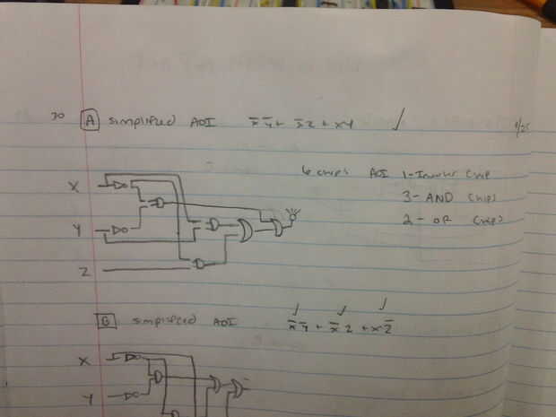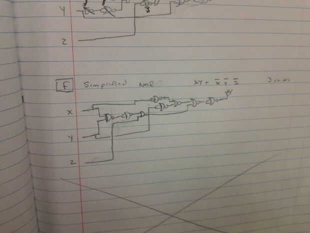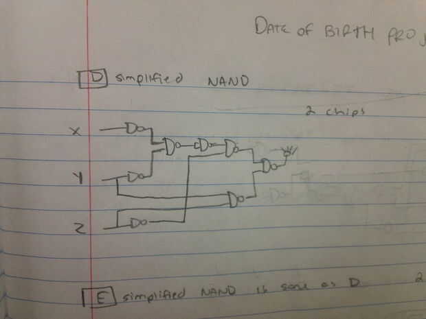 Después de tener todas sus palabras para cada segmento, está listo para desarrollar los circuitos. Escoger el tipo de circuito es simple, dibujar un circuito de AOI, NAND, y ni entonces elegir el circuito que tiene la menor cantidad de fichas (menos chips = más espacio en la protoboard). Repita este paso para todos los segmentos. Para este cumpleaños son 12 chips, incluyendo paquete de R, el 1 inversor, o 2 y 2, 2 NAND y NOR 4.
