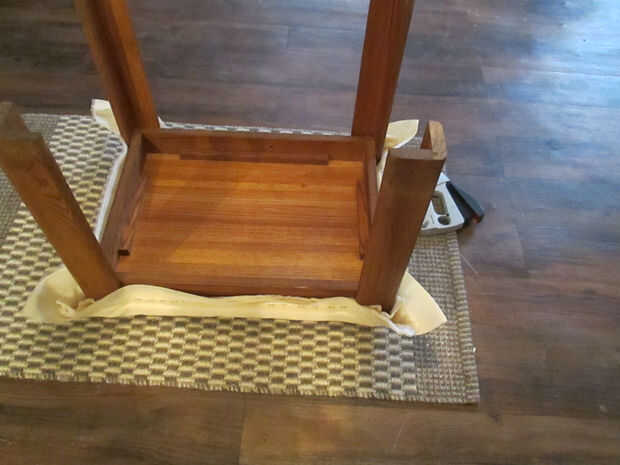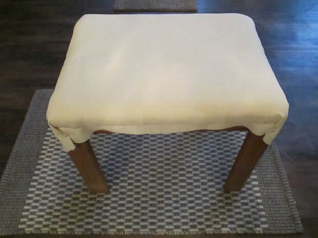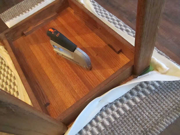 El bateo y bocací deben extenderse más allá de la espuma por unos poquitos. En mi caso había una repisa debajo de la mesa que yo grapado en, además de una pulgada de dos más allá de eso de un tirón. Quiere empezar con una grapa en el centro de un lado, luego hacia el otro lado, tirando de la tela una cantidad natural; no demasiado fuerte pero con mano firme, una cantidad de sensación natural que puede duplicar para la totalidad de los muebles.