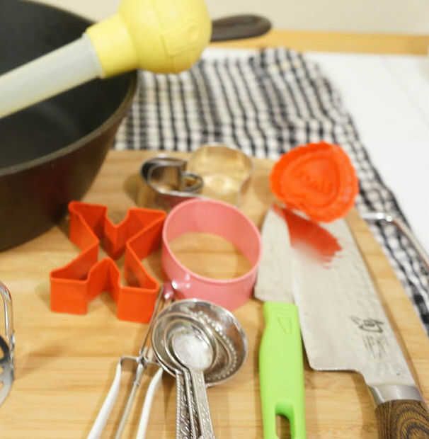Licuadora, sartén de horno y estufa top seguro hornear plato, así como tenedores, cucharas, cuchillo, medir tazas y cucharas, tablero de corte (cortadores de la galleta opcional) moldes de silicona, (opcionales), X-grande postal bolsa o bol cubierto, bakers twine, toallas de papel, jeringuilla para pavo, zester, selecciones de diente, plato de salsa, un plato para servir.