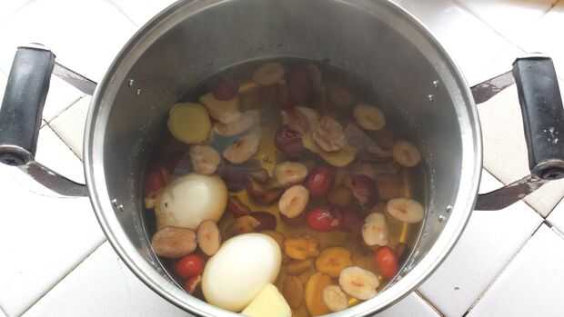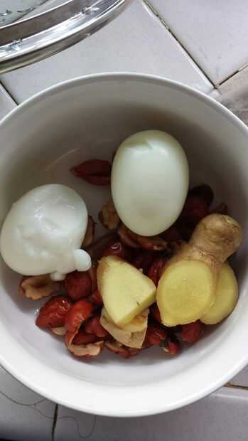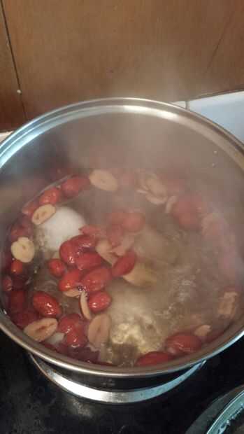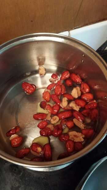 Llena tu olla con unos 2 litros de agua y gire la estufa a fuego alto. Mezclar en sus rebanadas de jengibre y aclarado las fechas rojas. Añadir una cucharada de azúcar para el sabor.