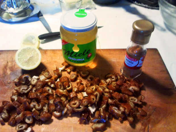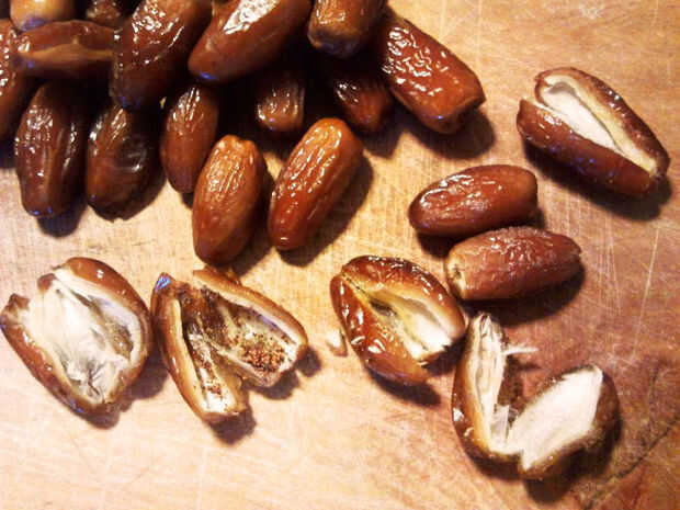 Después de eso, estás listo para picarlas en trozos pequeños con un cuchillo. Abrí las fechas a la mitad (ver foto) y luego en rodajas les en tres horizontalmente... Lo importante es que son un poco incluso.