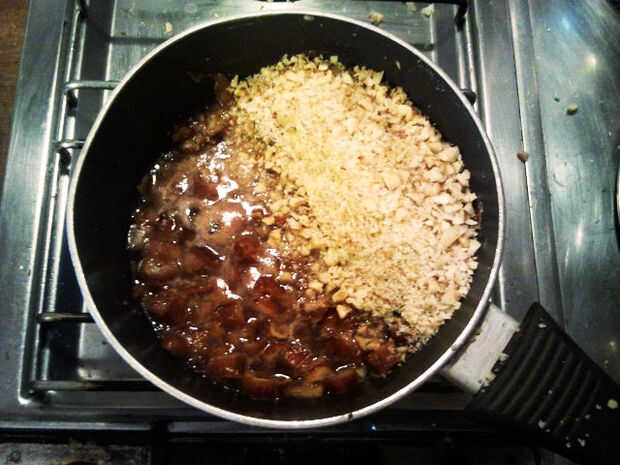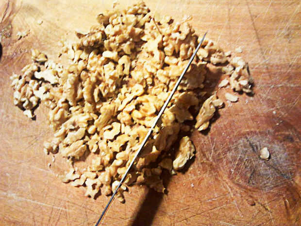 Segundo, tiempo para picar las nueces... Esto va más rápido si utilizas un cuchillo de picar, pero en realidad requiere un poco de paciencia para obtener los trozos pequeños y algo incluso...