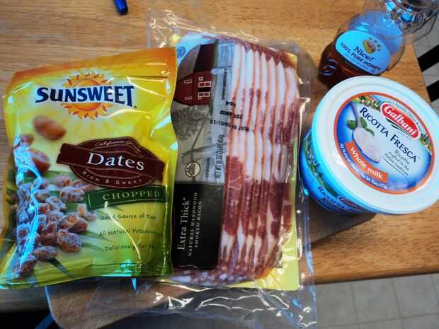 Los ingredientes que utilicé son los siguientes: -una bolsa de dátiles picados -un envase de queso ricota (creo que era 15 oz) -tocino (terminé haciendo casi 3 docenas de estas cosas y necesita un trozo de tocino para cada uno) -miel -sal