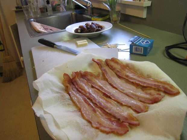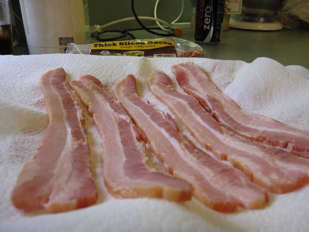 Par cocinar tocino en el microondas (~ 4 minutos entre toallas de papel). Me gusta ser todavía muy flexibles, pero no cruda. Esto reduce el tiempo de cocción, ahorrando el queso.