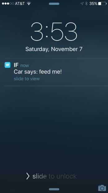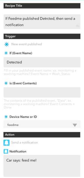 Crear una cuenta en IFTTT si no tiene uno ya y crear una nueva receta donde el disparador es un acontecimiento de canal de partícula (evento detectado en "el nombre de fotón") y la acción es una notificación a la aplicación IFTTT ("coche dice: feed me!").