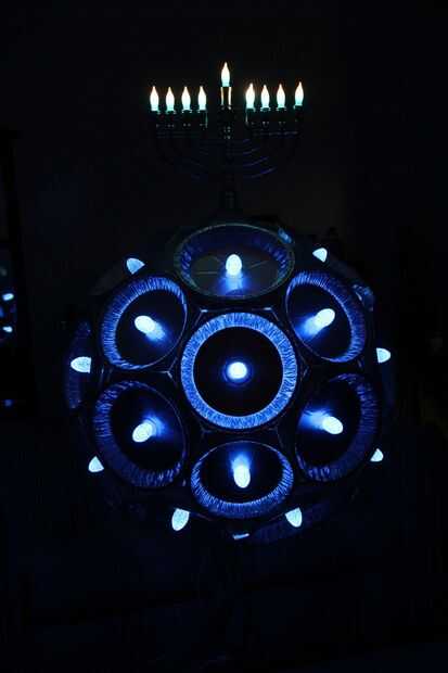 La celebración de LED luces menorá tiene azul oscuro fuera con luz interior azul, con un candelabro encendido estándar en el estante superior.
