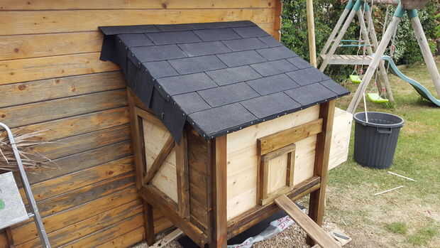 Las gallinas no le gusta agua así que decidimos cubrir techos con betún. Es una de la tanga más caro que tenía que comprar.