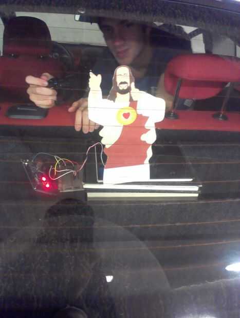 Cuando alguien te deja de pasar en el tráfico puede presionar un botón en el volante para activar un motor de servo que muestra una ilustración de Jesús en la ventana trasera de su coche.