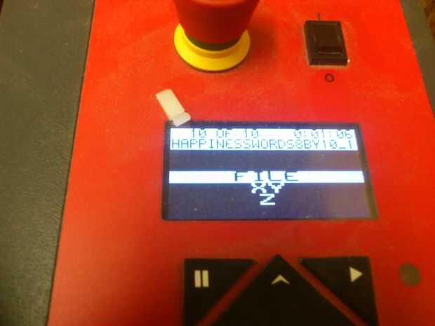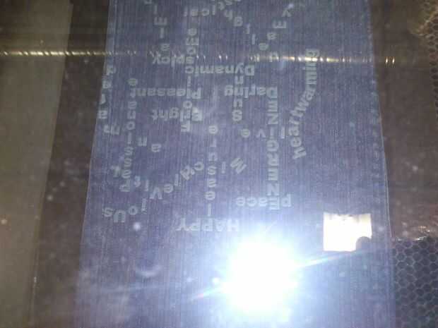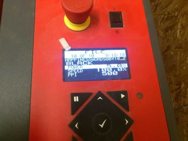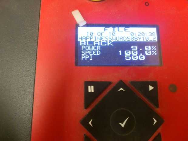 La máquina pondrá en marcha inmediatamente y se verá que si su colocación en la x, y, espacio z ha sido estrecha... esto estaba bastante cercano. Si usted está preocupado mientras se ejecuta el diseño del poder demasiado poco o demasiado grande es fácil de entrar en el archivo mientras se ejecuta pulsando "play" en la máquina, desplazamiento hacia abajo usando el arriba, abajo las flechas y aumento, disminución de la potencia, velocidad o ppi, utilizando la izquierda, derecha.