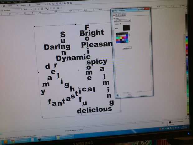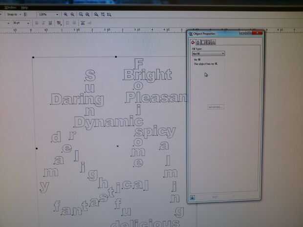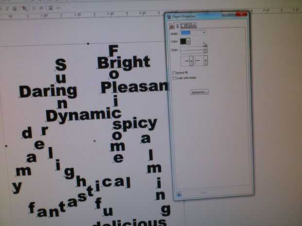 - todas las letras que se indica por una línea de cabello. En Corel Draw la ventana de propiedades del objeto le permitirá hacer esto una vez que su diseño es seleccionado. (Nota: si ejecutar la prueba en la máquina Universal Laser la línea también tiene que ser cambiado a color rojo (rgb rojo))
