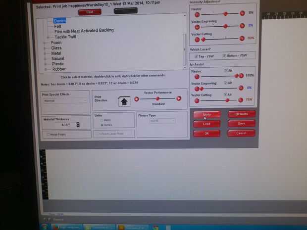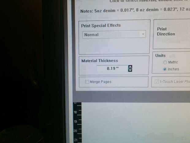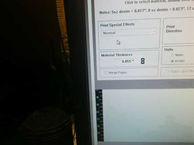 - Presione el botón de configuración para elegir el material. Recogido de la tela del dril de algodón, pero un poco engañado. El grosor predeterminado dado era 0,055". Sin embargo, este material fue doblado sobre una vez y a veces dos veces para que grueso no funcionaría. La forma correcta para hacer frente a esto sería elegir un Tipo de accesorio de costumbre y una altura de material de apoyo. Sin embargo, por alguna razón que era gris y yo no podíamos elegir esa opción. Donde hay una voluntad hay un camino aunque - así sólo se cuadruplicó el espesor del material. Esto significó que el laser estaba fuera de foco - sin embargo para el aguafuerte no estaba muy preocupado. (Nota: hay un grueso material máximo podría escribir que para el dril de algodón fue fijado en 0,2")