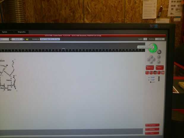 Antes de llegar a jugar he intentado tomar las medidas de donde el diseño era en la cama láser y donde quiero el diseño a ser grabadas. Entonces intentó coincide con esta posición de diseño en la parte de software (en el Panel de Control Universal). Asegúrese de que la máquina del laser está en... luego pulsa el botón de play verde.