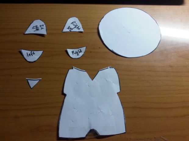 Cortar los brazos y las piernas del patrón. Y también un triángulo de la parte superior de la camisa.