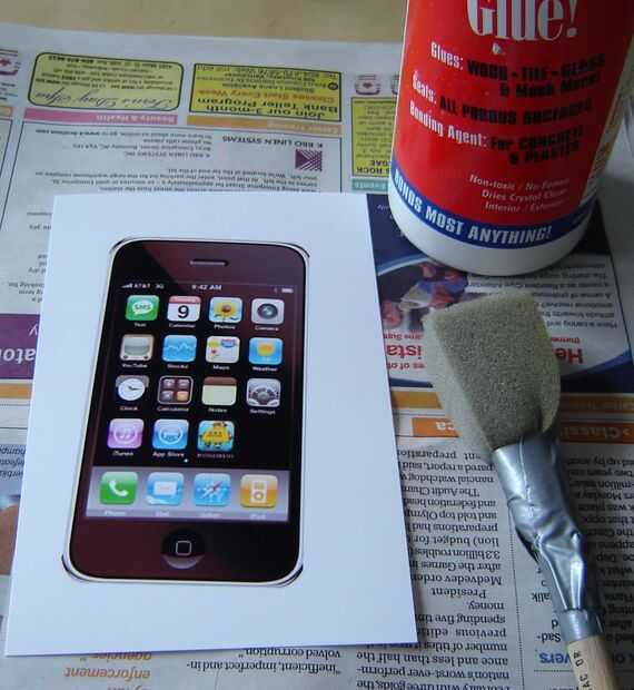 Cubrió la impresión para protegerla del desgaste con un pegamento transparente. Mod Podge o un spray acrílico transparente puede utilizarse así, mejor probar primero en caso de que hace la tinta ejecutar. Utilicé un pincel de espuma, ya que un cepillos regulares tienden a líneas de hojas. Manera uniforme y generosamente sobre la impresión de todo, evitar las burbujas de aire. Dejar secar en algún lugar alejado del polvo y los gatos curiosos. El pegamento que usé tiene 24 horas para curar totalmente. Cuando esté seco corte el fondo blanco por lo que tenemos a la pantalla del Iphone.