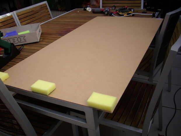Coloque las piezas planas de papel de aluminio en la base uniformemente! Difunde a través de modo que los 3! Luego, tomar una pistola de pegamento caliente y pegamento a la base. Luego, tomar la segunda parte de la madera y poner las esponjas y marca donde había puesto la hoja de la parte inferior con un edding. Entonces, pedazos de papel aluminio de centro los otros 3 en sus marcas para asegurarse de que presión se aplica en cualquier lugar en la estera, que el pedazo plano de fondo de hoja de lata toca la parte superior, cilindro arrugado en forma de pieza perfectamente, porque de lo contrario un efecto puede falta!