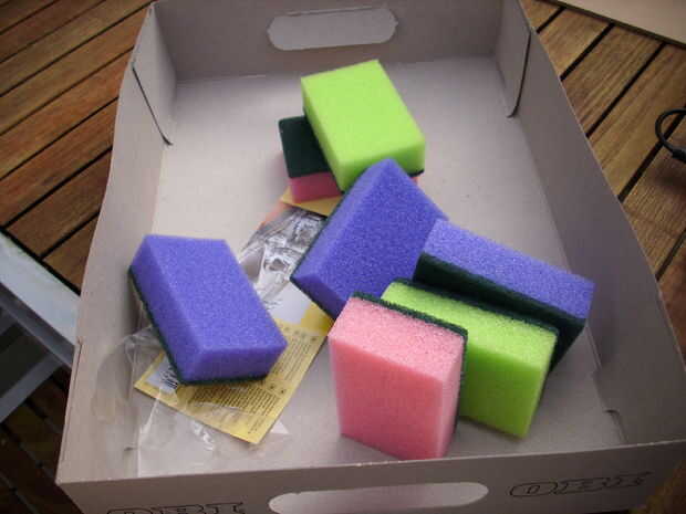 Coloque la placa de base de madera en el piso. Añadir las esponjas cerca de los bordes de la placa pero no lo hacen ir por el borde. Las esponjas más añade, el peso más se necesita para empujar hacia abajo. Por lo tanto, si usted quiere añadir un montón de hojas, tomar más esponjas que de costumbre.
