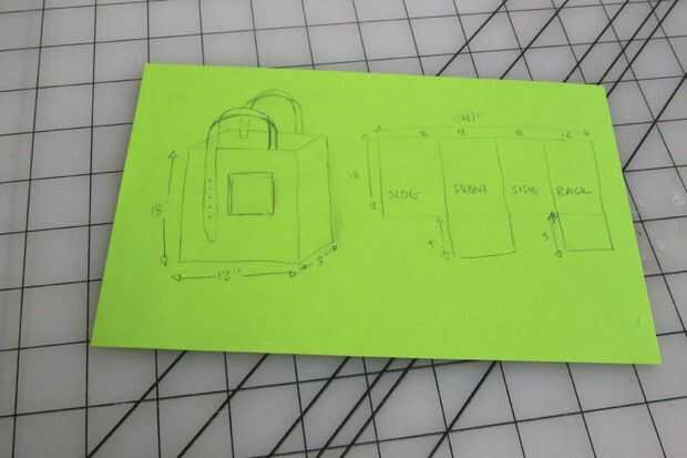 Quería mi bolsa a 18 pulgadas de alto, así que para hacer esto, alternan largos para ambos lados el frente y la parte posterior de la bolsa (ver imagen de aclaración). Los lados que corte en 18 pulgadas, pero para el frente y detrás añadí 5 pulgadas en la parte inferior, que se reunirá en una superposición de 1 pulgada para crear la parte inferior de la bolsa.