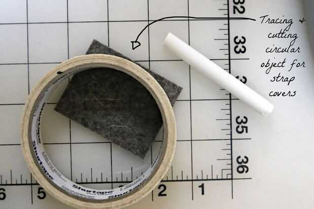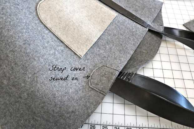 En primer lugar, yo había preparado el punto de la correa de fieltro por recortes extras todos los extremos del hilo. Luego, con el mismo fieltro coloreado, hizo pequeños parches, muy similares al bolsillo que cosí en antes, incluso usando el mismo rollo de cinta para crear el fondo de los parches. Hice dos de estos, uno para cada correa, luego top había cosido esto sobre el cuerpo de la bolsa.